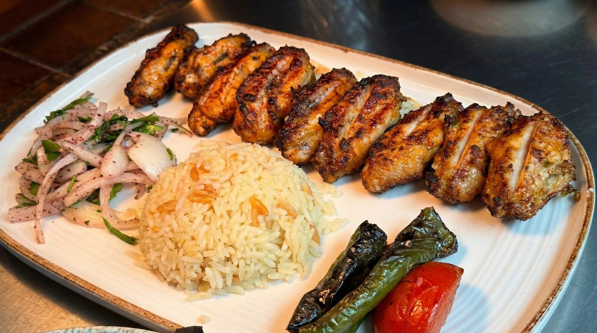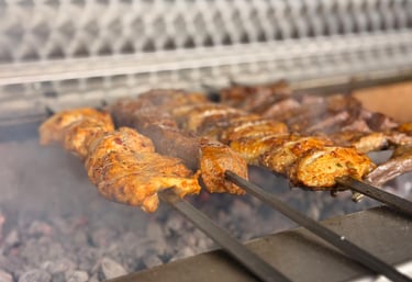 Cubes of marinated lamb cooked on a charcoalgrill and served with rice and salad. (D) (G) (S)