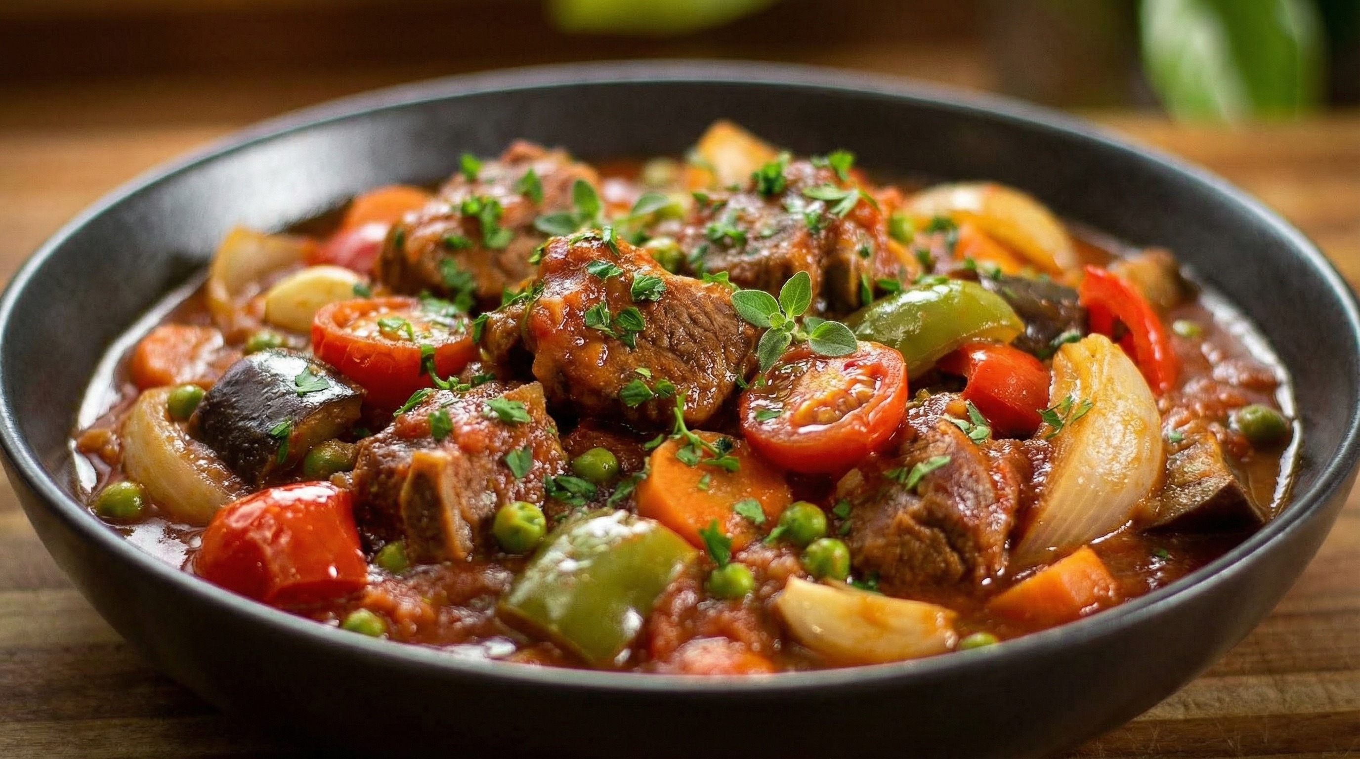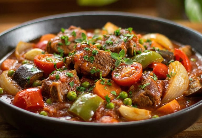 Slow-cooked lamb with aubergine, peppers, tomatoes, onion and garlic in a rich tomato sauce. (D)