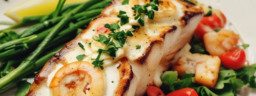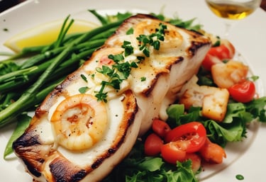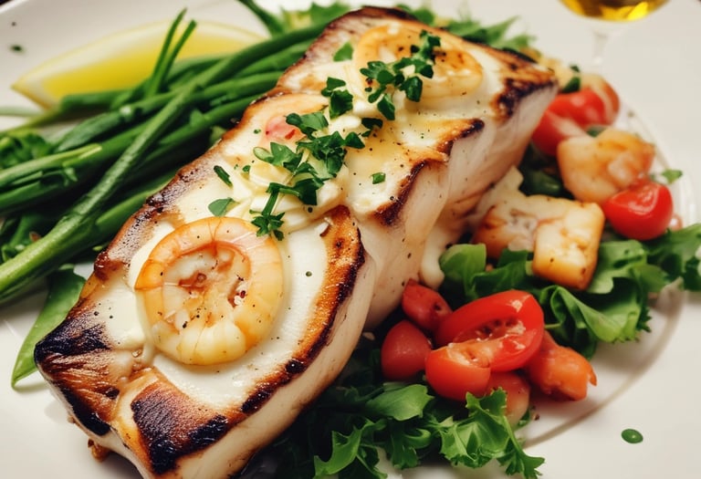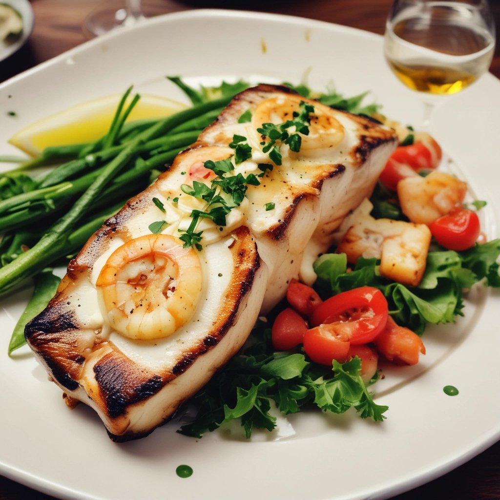 Chargrilled sea bass fillets topped with prawns, garlic cream and white wine sauce. Served with salad.