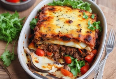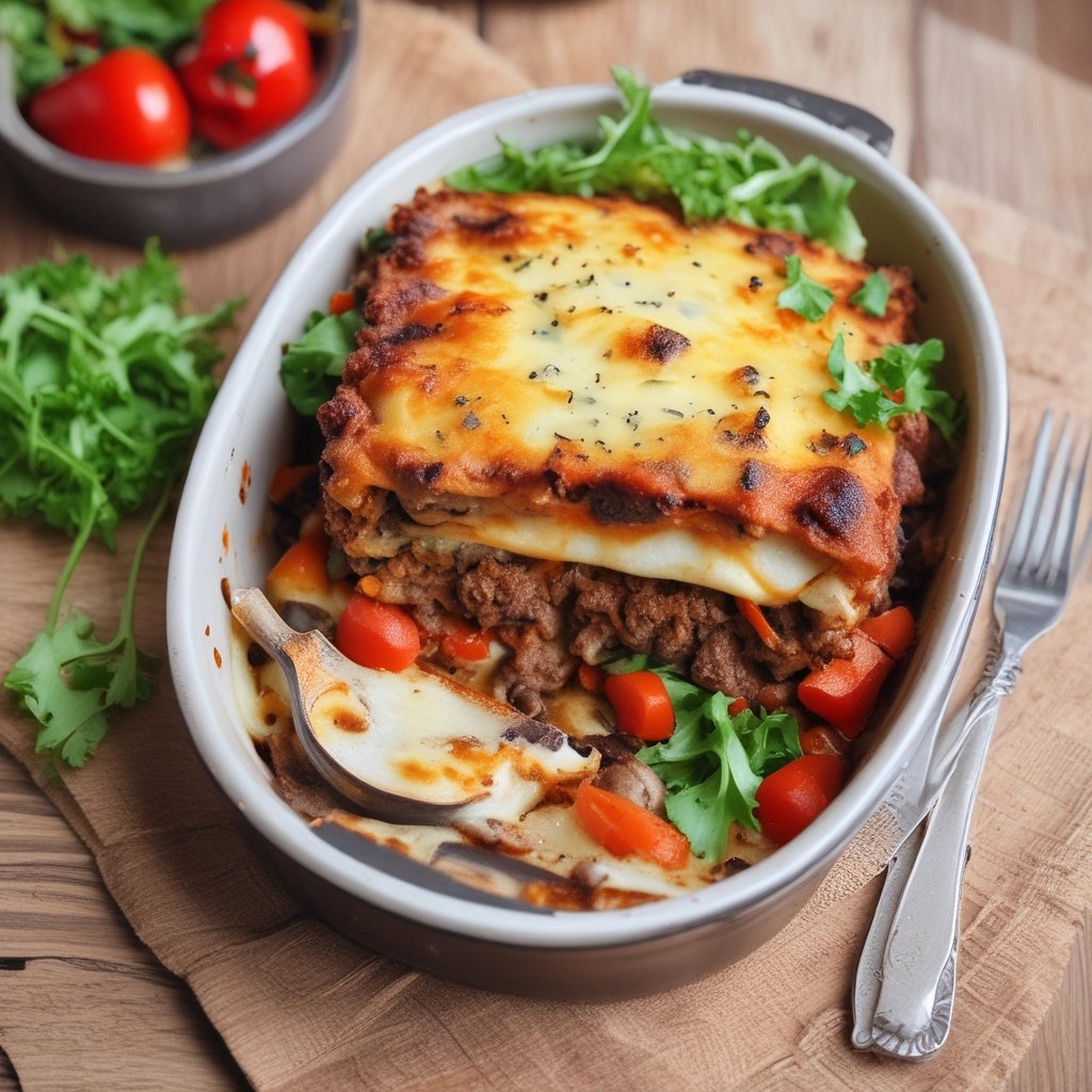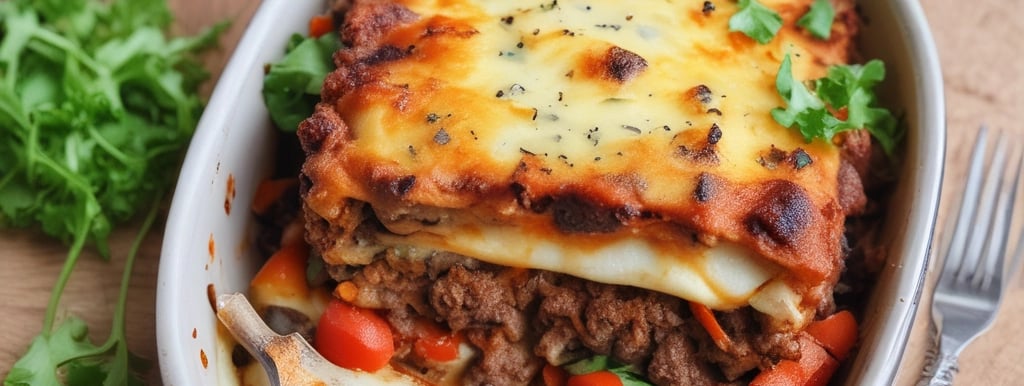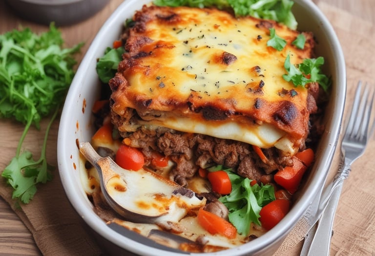 Oven baked moussaka with layers of minced lamb, aubergine, peppers, potato, carrot topped with
