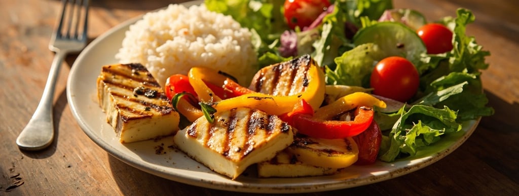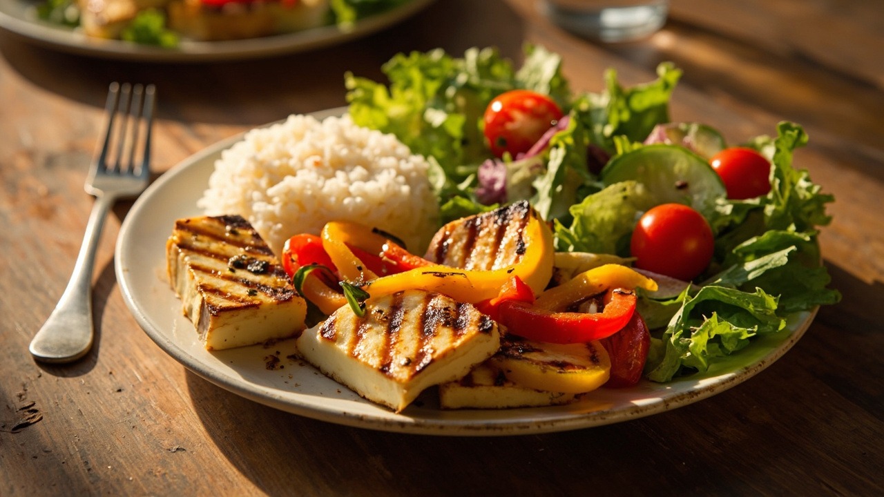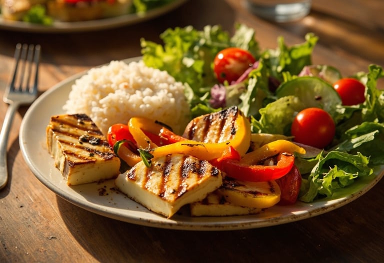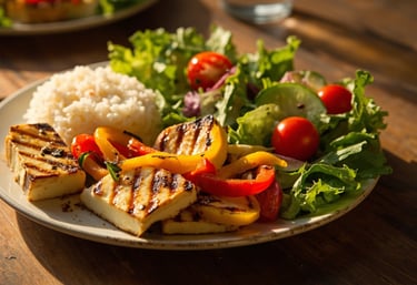 Grilled halloumi mixed with peppers and served with rice and salad. (V) (D) (S) (G)
