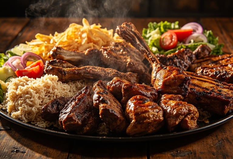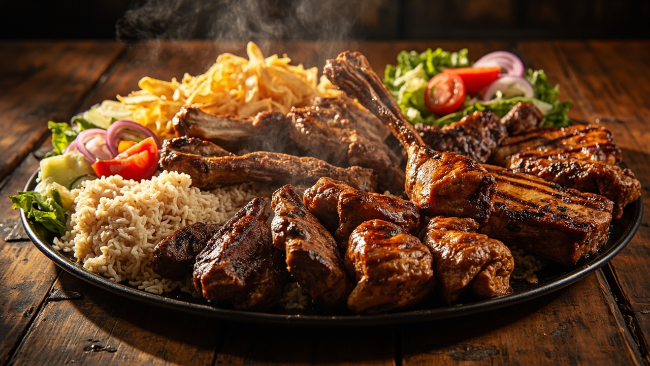 Lamb shish, chicken shish, lamb kofte, chicken wings,lamb chops, lamb ribs, served with rice and salad.